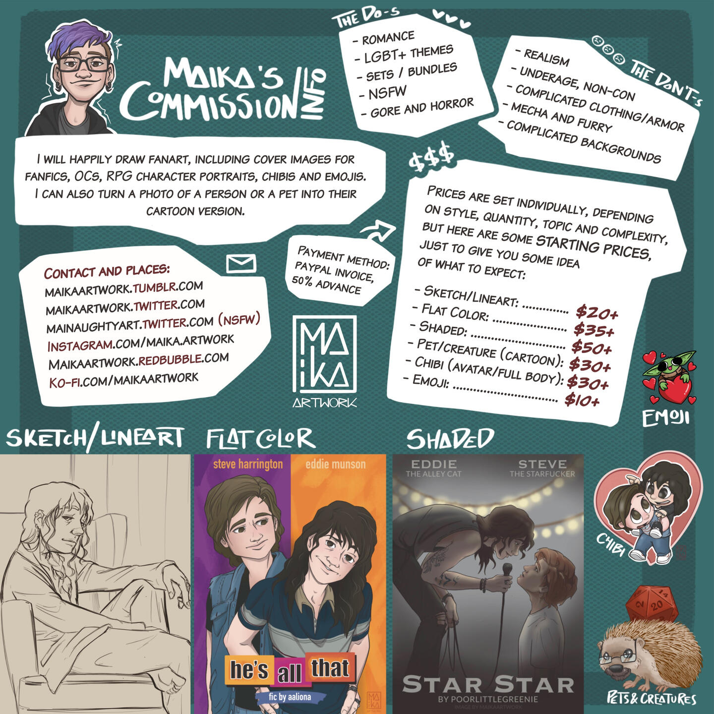 Hi, I'm morgan (they/them). I draw digital artwork, mostly fanart and portraits (both from photo and OCs). Sometimes I dabble in making emoji and drawing pets, chibi characters, and nsfw content.All commissions I do are priced individually. Below you can find some starting prices and my portfolio, please contact me with details for a quote.